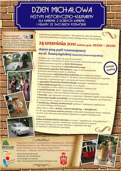 24 września 2011 roku godz: 11:00 - 21:00 - Zapraszamy wszystkich sąsiadów i Mieszkańców całej Michałowa, czyli ziem położonych między ulicami Radzymińską a Kawęczyńską - skwer przy pętli tramwajowej.