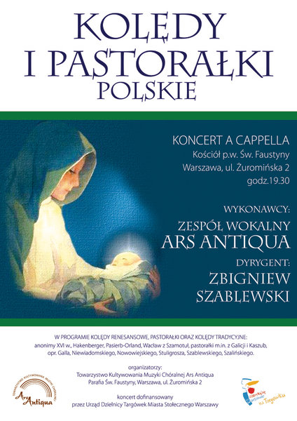 W trakcie koncertu świątecznego „Kolędy i pastorałki polskie” odbędziemy muzyczną podróż w czasie i przestrzeni razem z zespołem wokalnym „Ars Antiqua”. Usłyszymy mniej znane kolędy epoki renesansu (w opracowaniu m.in. Wacława z Szamotuł i Andrzeja Hankenbergera), popularne pastorałki Podhala i Podbeskidzia oraz kolędy tradycyjne (we współczesnym opracowaniu m.in. Stefana Stuligrosza czy Stanisława Niewiadomskiego).
