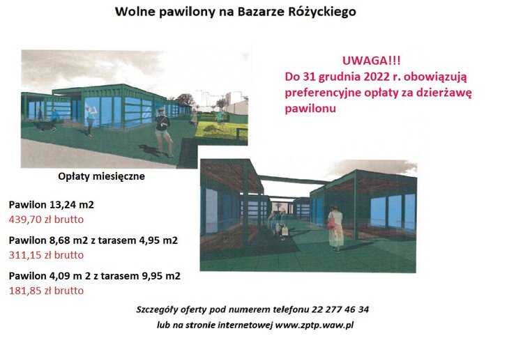 Do 31 grudnia 2022 r. obowiązują preferencyjne opłaty za dzierżawę pawilonów na Bazarze Różyckiego - informuje Zarząd Praskich Terenów Publicznych. Ceny w zależności od wielkości pawilonu wynoszą od 181,85 zł do 439,70 zł brutto.