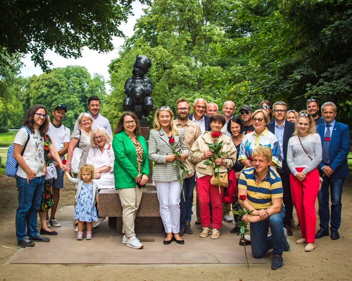 Mateusz Mroz z kopią rzeźby, fot. Zarząd Zieleni Warszawy