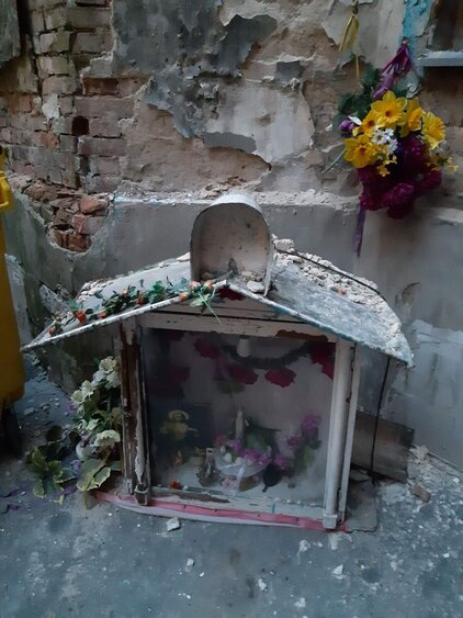Na początku sierpnia br. pan Radek poinformował praskie Stowarzyszenie Porozumienie dla Pragi o uszkodzonej kapliczce na podwórku przy Środkowej 25. Po przybyciu ma miejsce Krzysztof Michalski, który jest członkiem Stowarzyszenia Porozumienie dla Pragi, a jednocześnie Społecznym Opiekunem Zabytków ujrzał kapliczkę w złym stanie technicznym leżącą na ziemi. Znalazła się tam najprawdopodobniej po zerwaniu uszkodzonych zębem czasu mocowań. Stan, w jakim się wówczas znajdowała możecie zobaczyć na zdjęciu poniżej. Pan Krzysztof poinformował o sytuacji Zakład Gospodarowania Nieruchomościami w Dzielnicy Praga Północ i Stołecznego Konserwatora Zabytków.