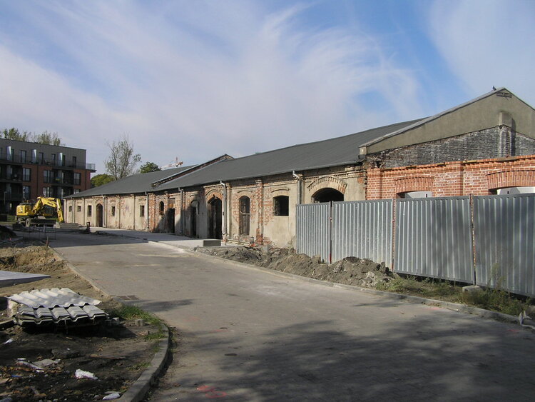 Częściowo wyburzone budynki powstały jako jedne z pierwszych na tym terenie. Początkowy pełniły funkcję stajni, następnie były wykorzystywane jako magazyny. W czasie okresie I wojny światowej były w niej przechowywane karabiny, a po 1918 roku znajdował się tu warsztat mechaniczny.