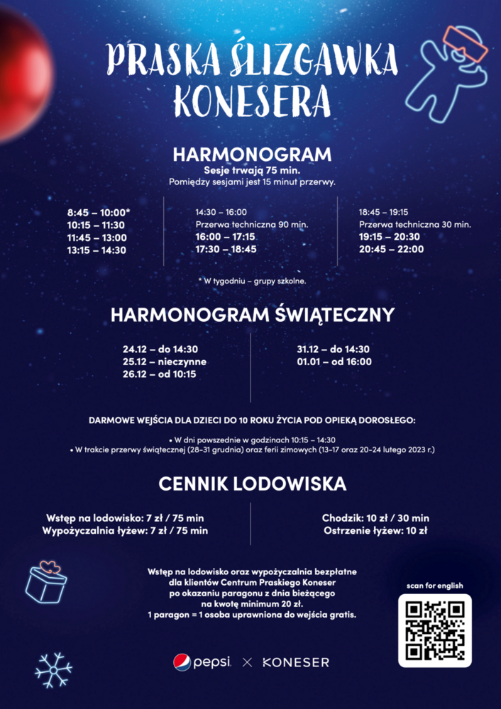 Wstęp na lodowisko kosztuje 7 zł za 75 minut. Tyle będzie trzeba też zapłacić za wypożyczenie łyżew. Specjalna oferta czeka jednak na klientów Centrum Praskiego Koneser. Okazując paragon za zakupy o wartości minimum 20 złotych z bieżącego dnia, klienci będą mogli skorzystać zarówno z lodowiska, jak i wypożyczalni łyżew bezpłatnie (jeden paragon uprawnia jedną osobę do wejścia za darmo). Dodatkowo, w dni powszednie (w godz. 10.15-14.30) dzieci do 10 roku życia, pod opieką osoby dorosłej, również wejdą na „Praską Ślizgawkę” bezpłatnie. Oferowana będzie też usługa ostrzenia łyżew (10 zł), a także możliwość wypożyczenia chodzika (10 zł/30 min). Dodatkowe atrakcje na lodowisku przygotował partner „Praskiej Ślizgawki” – PepsiCo Polska.