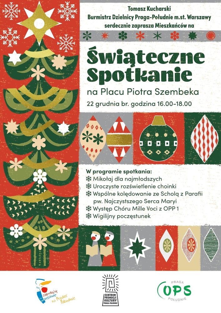 Dokładnie 10 lat temu - 12 grudnia 2012 roku z okazji zakończenia przebudowy placu Szembeka władze dzielnicy Praga Południe zainaugurowały Świąteczne Spotkania Bożonarodzeniowe z mieszkańcami. Ta coroczna tradycja jest kontynuowana do dziś, i tak w tym roku spotkanie obędzie się 22 grudnia 2022 roku o godzinie 16.00.