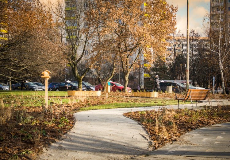 Rozległy trawnik zamienił się w przyjazny pocket park z nową roślinnością. Mieszkańcy zauważą tam trzy jabłonie, a także niemal 200 nowych krzewów, w tym m.in. róże "Spinacer", derenie białe "Aurea" oraz śnieguliczki "Amethyst". Posadzono także byliny i rośliny cebulowe. Łącznie pojawiło się około 2,5 tys. roślin.