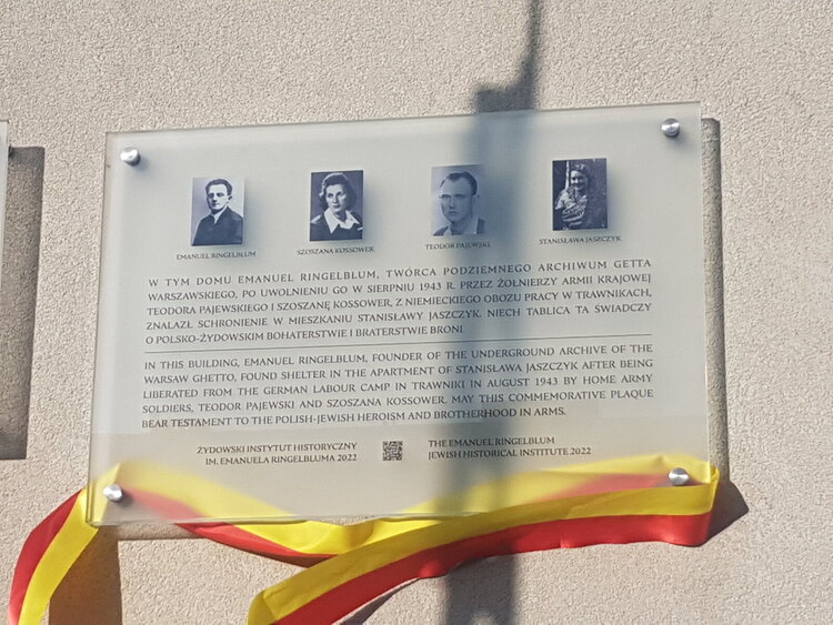 Na tablicy upamiętniono też Szoszanę Kossower ps. Emilia Rozencwajg, łączniczkę ŻZW i żołnierza Armii Krajowej, która pomogła w uwolnieniu Emanuela Ringelbluma z obozu pracy w Trawnikach.