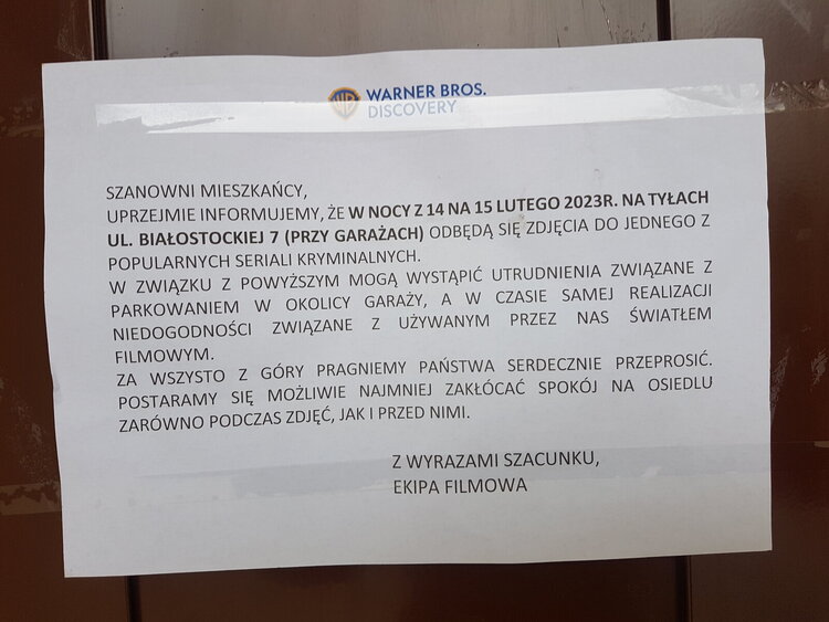 W nocy z 14 na 15 lutego br. ekipa filmowa Warner Bros. Discovery będzie realizować sceny do jednego z seriali kryminalnych. Zdjęcia będą realizowane w rejonie garaży przy Białostockiej 7 i mogą wystąpić problemy z parkowaniem i dostępem do garaży. Również mieszkańcy bloku muszą się liczyć z użytym w nocy światłem filmowym.