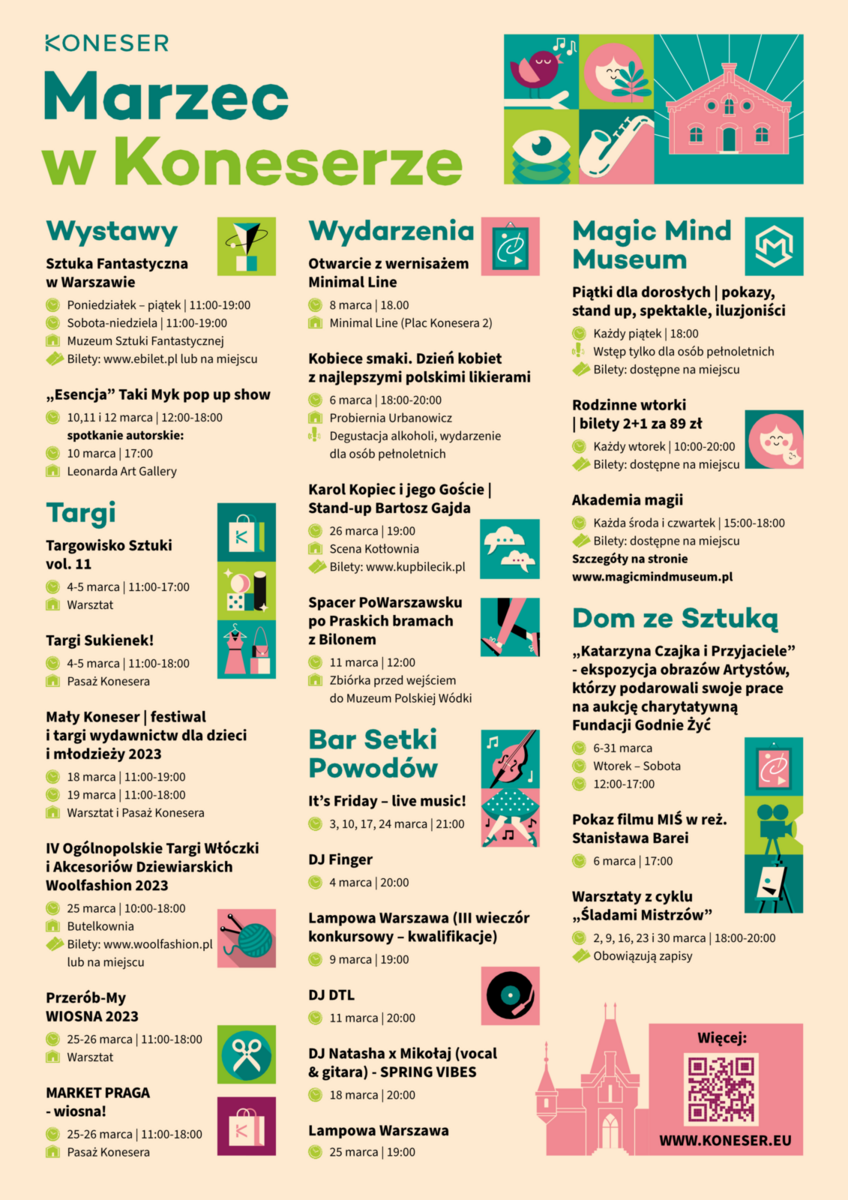 Setki wydarzeń, dziesiątki wystaw, działające na co dzień muzea i galerie. To w telegraficznym skrócie Centrum Praskie Koneser, gdzie do zobaczenia jest naprawdę wiele. Unikalne Muzeum Polskiej Wódki, jedyne w swoim rodzaju Magic Mind Museum (muzeum iluzji) i Muzeum Sztuki Fantastycznej z dziełami takich mistrzów jak Zdzisław Beksiński czy Jerzy Duda-Gracz. Oprócz tego – Art Sułek Space, Dom ze Sztuką, Leonarda Art Gallery i ToTuart. Dodatkowo, przez cały rok w przestrzeniach Konesera, również na placu Konesera, odbywają się sztuki teatralne, koncerty, wystawy i kino plenerowe czy animacje dla dzieci.