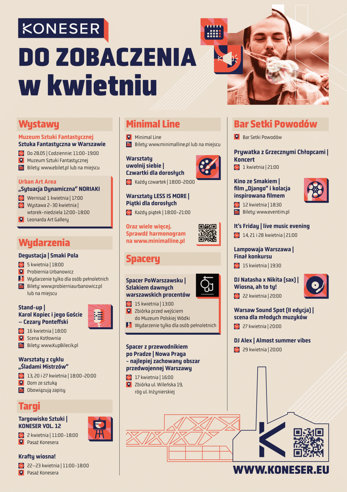Wiosna to pora roku, która jak żadna inna łączy się z kreatywnością i lekkością. Zimowe, ciepłe ubrania zastępują zwiewne koszule i sukienki, dające mnóstwo możliwości stworzenia niepowtarzalnych stylizacji. I właśnie w tym duchu Centrum Praskie Koneser zachęca do różnorodnych aktywności. A okazji do wyjścia z domu po zimowej drzemce pod kocami jest multum. Wśród nich są między innymi darmowy spacer z PoWarszawsku szlakiem stołecznych alkoholi (15 kwietnia, godz. 13.00, dla osób dorosłych) czy wystawy „Sztuka Fantastyczna w Warszawie” z pracami Zdzisława Bekisńskiego na czele (Muzeum Sztuki Fantastycznej, do 28 maja) i monograficzna „Sytuacja Dynamiczna” Noriakiego w Leonarda Art Gallery (do 30 kwietnia). Dodatkowe atrakcje można znaleźć na afiszu, a „Do zjedzenia. Do zobaczenia. Do usług” jest jeszcze więcej!