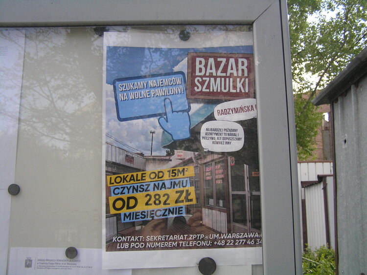 Zarząd Praskich Terenów Publicznych szuka najemców na wolne pawilony na terenie bazarku "Szmulki". Z rozwieszonych na terenie targowiska plakatów szczególnie zwraca uwagę cena miesięcznego czynszu, który w przypadku pawilonu o powierzchni 15 m2 wynosi 282 zł.
