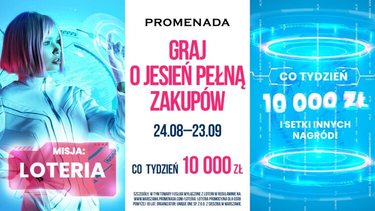 Czekasz na uśmiech losu? Nie przegap swojej szansy i dołącz do niezwykłej misji, by zdobywać nagrody! W warszawskim centrum handlowym Promenada startuje nieziemska loteria „Misja: Loteria! Operacja: Wygrana!”! Co tydzień do wygrania jest 10 tysięcy złotych, które trafi wprost na konto zwycięzcy! Ponadto czekają dostępne od ręki fantastyczne nagrody natychmiastowe – karty podarunkowe na zakupy, vouchery usługowe oraz setki nagród rzeczowych w postaci sprzętu audio i elektronicznego! Jest o co powalczyć! Okres promocyjny loterii ruszył 24 sierpnia i potrwa cztery długie tygodnie, do 23 września 2023 r, godz. 20.00.