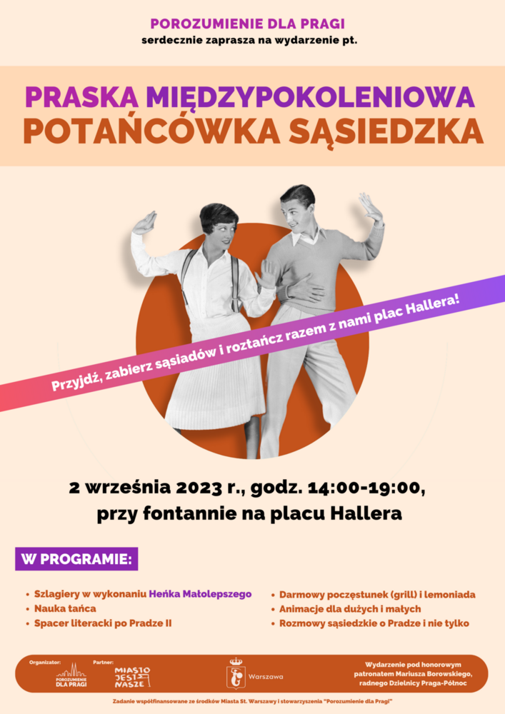 Porozumienie dla Pragi serdecznie zaprasza w najbliższą sobotę, 2 września, od godziny 14:00 na Plac Hallera na Praską Międzypokoleniową Potańcówkę Sąsiedzką. Czeka masa atrakcji: animacje dla dużych i małych, warsztaty, spacer literacki po Pradze II, nauka tańca oraz koncert kapeli Heńka Małolepszego podczas części tanecznej. Nie zabraknie również pysznego jedzenia. Serdecznie zapraszamy.