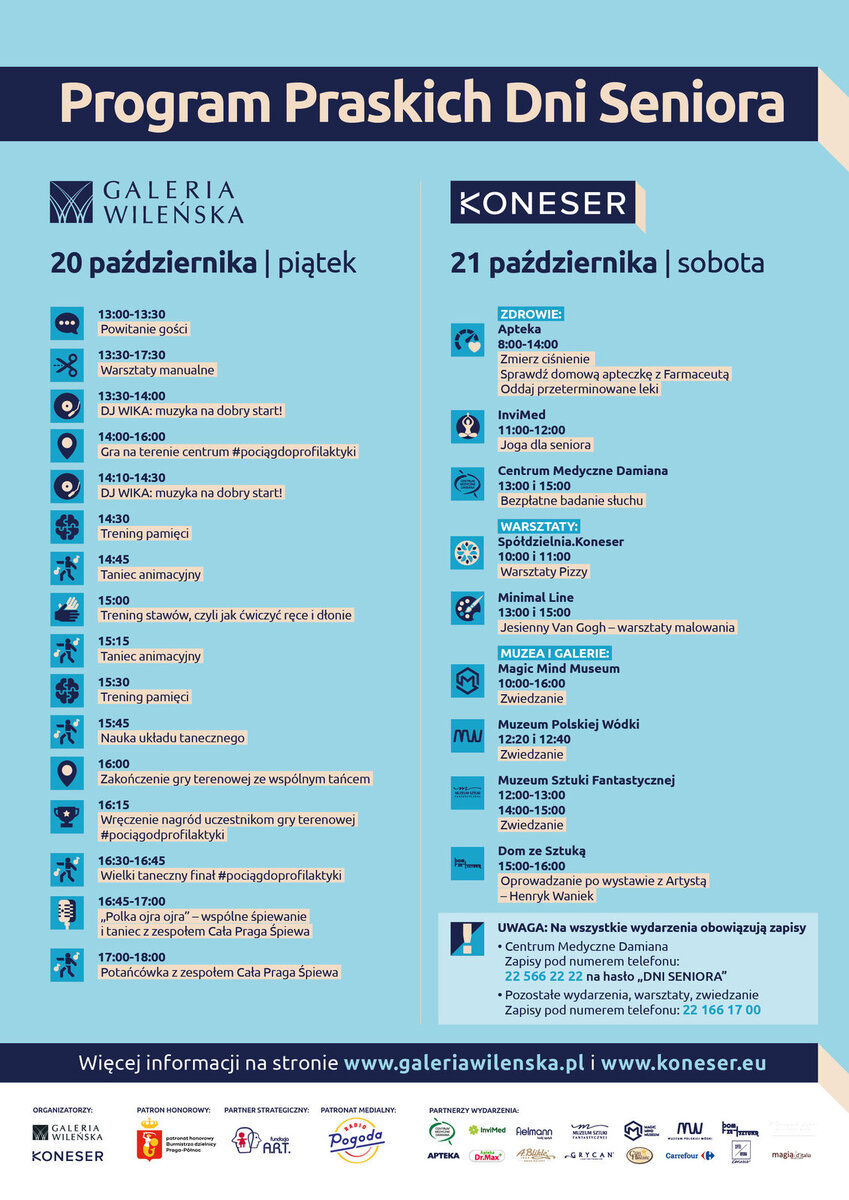 Galeria Wileńska i Centrum Praskie Koneser po raz kolejny otwierają się na seniorów. Trzecia edycja Praskich Dni Seniora, wydarzenia wypełnionego atrakcjami, odbędzie się już 20 i 21 października. W ramach tej inicjatywy, uczestnicy będą mogli wziąć udział w serii interesujących warsztatów, skorzystać z bezpłatnych badań medycznych oraz cieszyć się wieloma innymi rozrywkami.