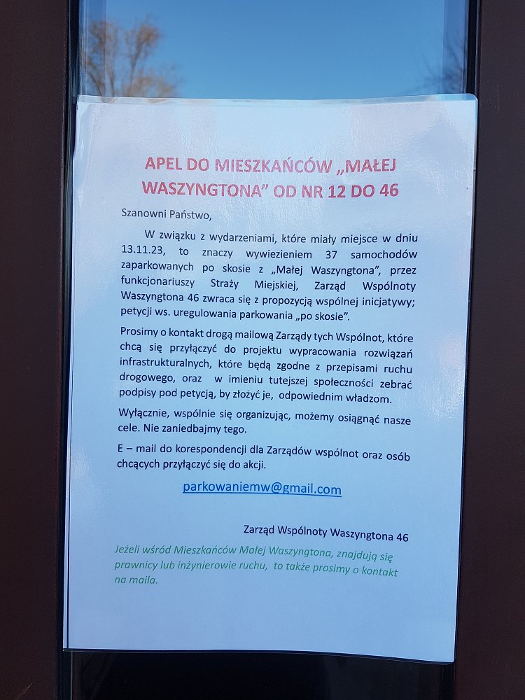 Na "małej" al. Waszyngtona od ul. Saskiej do ul. Międzynarodowej parkowanie "po skosie" czyli częściowo na chodniku i jezdni zostało przeniesione wyłącznie na chodnik. W tej sprawie zamierza interweniować wspólnota mieszkańców z Al. Waszyngtona 46, która w apelu zwraca się do sąsiednich wspólnot o przygotowanie wspólnej inicjatywy - petycji ws. uregulowania parkowania "po skosie".
