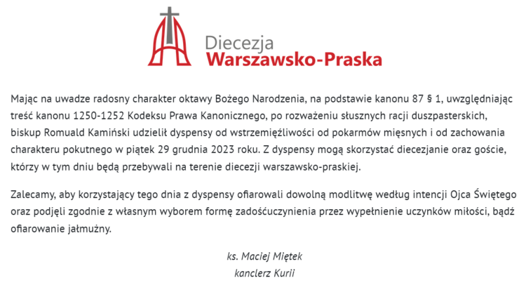 - Mając na uwadze radosny charakter oktawy Bożego Narodzenia, na podstawie kanonu 87 § 1, uwzględniając treść kanonu 1250-1252 Kodeksu Prawa Kanonicznego, po rozważeniu słusznych racji duszpasterskich, biskup Romuald Kamiński udzielił dyspensy od wstrzemięźliwości od pokarmów mięsnych i od zachowania charakteru pokutnego w piątek 29 grudnia 2023 roku - informuje kanclerz Kurii Warszawsko-Praskiej, ks. Maciej Miętek.