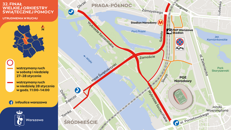 Większe ograniczenia w ruchu będą wprowadzone w niedzielę – w czasie 18. Warszawskiego Biegu WOŚP „Policz się z cukrzycą”. Jego uczestnicy wystartują o godzinie 11:40 z serca miasteczka WOŚP, usytuowanego nieopodal stacji PKP Warszawa Stadion. Biegacze do pokonania będą mieli pięciokilometrową trasę poprowadzoną ulicami: Sokolą, Zamoście, przez most Świętokrzyski (zawrotka przy Wybrzeżu Kościuszkowskim), Wybrzeżem Szczecińskim, Siwca do mety na błoniach PGE Narodowego.W związku z biegiem o godzinie 11:00 zamknięte zostaną ulice Sokola i Zamoście (od Zamoyskiego do Wybrzeża Szczecińskiego), Wybrzeże Helskie i Wybrzeże Szczecińskie (od ulicy Okrzei do łącznic z mostem Poniatowskiego), Wybrzeże Kościuszkowskie (od Zajęczej do Tamki), Tamka (od Dobrej do Wybrzeża Kościuszkowskiego), a także most Świętokrzyski. Ruch na tych drogach zostanie wznowiony o godzinie 14:00.Dojazd i powrót
