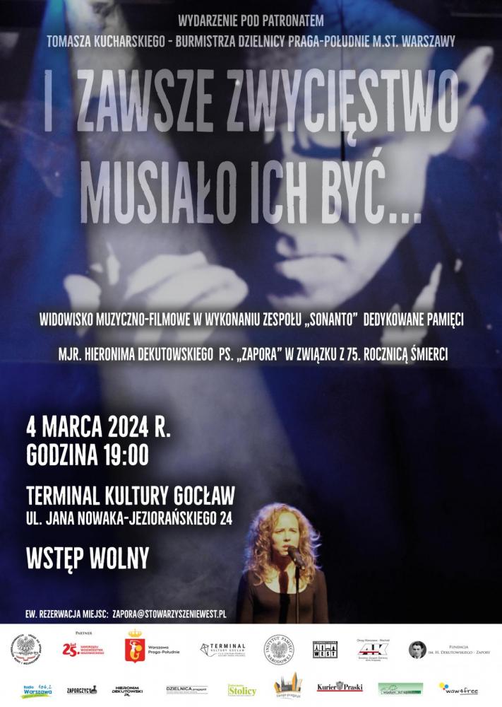 W imieniu Urzędu ds. Kombatantów i Osób Represjonowanych, Urzędu Marszałkowskiego Województwa Mazowieckiego, Urzędu Dzielnicy Praga-Południe m.st. Warszawy, Stowarzyszenia WEST, Światowego Związku Żołnierzy AK Warszawa-Wschód oraz Fundacji im. H. Dekutowskiego „Zapory” serdecznie Państwa zapraszamy na widowisko muzyczno-filmowe, dedykowane pamięci Hieronima Dekutowskiego „Zapory” w związku z 75. rocznicą śmierci.