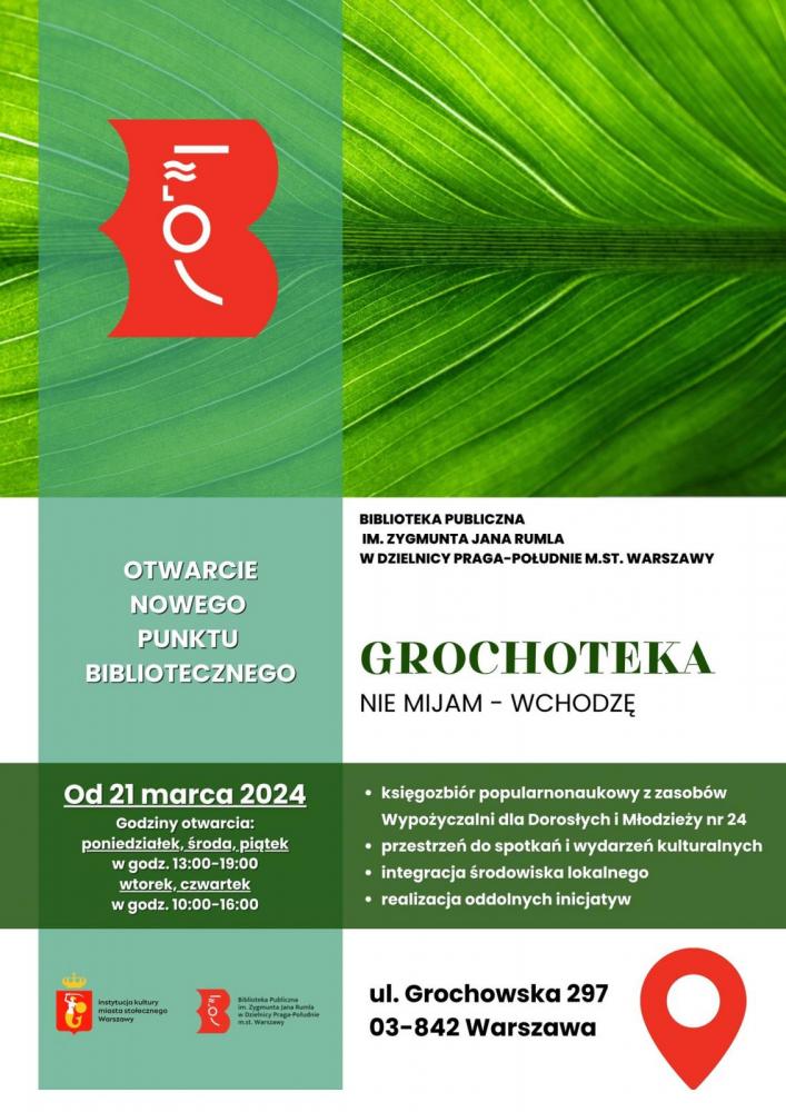 W przebudowanej i nabudowanej dwa lata temu kamienicy przy Grochowskiej 297 została dziś uroczyście otwarta Grochoteka - będąca jednocześnie filią istniejącej Wypożyczalni dla Dorosłych i Młodzieży nr 24 z pobliskiej Grochowskiej 279. Jak zapewniają urzędnicy, stary punkt biblioteczny ma dalej funkcjonować oferując czytelnikom m.in. literaturę beletrystyczną.