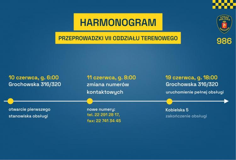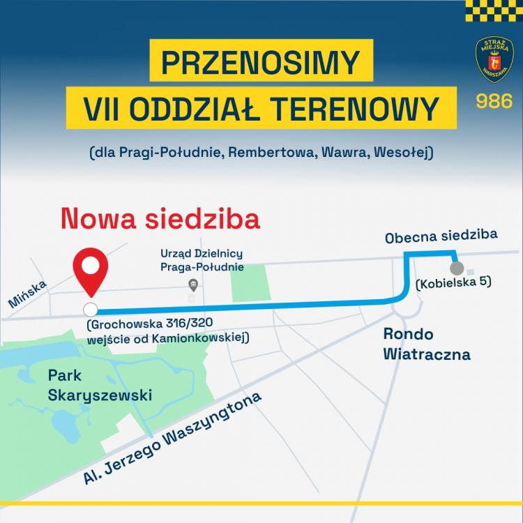 W dniach 10 - 18 czerwca VII Oddział Terenowy Straży Miejskiej z ulicy Kobielskiej 5 zostanie przeniesiony do biurowca przy Grochowskiej 316/320 (wejście od ulicy Kamionkowskiej) na Kamionku. Zgodnie z harmonogram obsługa mieszkańców zostanie uruchomiona w nowej siedzibie we wtorek 18 czerwca od godziny 18:00 a dzień później zostanie zamknięty oddział w dawnej szkole.