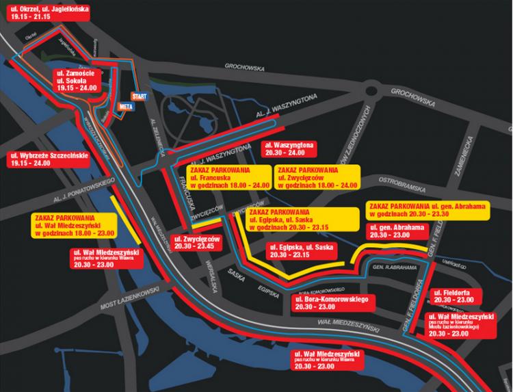 Około pół godziny przed startem biegaczy, około godziny 19:00, zamknięte zostaną ulice Zamoyskiego, Jagiellońska, Okrzei. Kierowcy ponownie przejadą tu po 21:30. W godzinach 19:00-24:00 nieprzejezdne będą również ulice Sokola i Wybrzeże Szczecińskie. W tym czasie kierowcy jadący od strony ogrodu zoologicznego będą musieli skręcić już w Ratuszową.