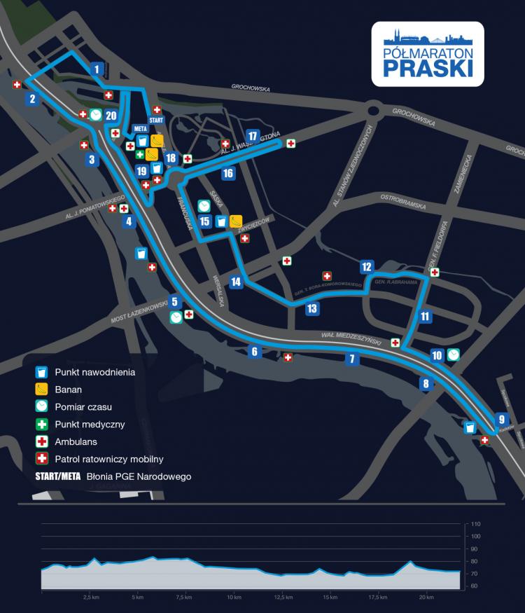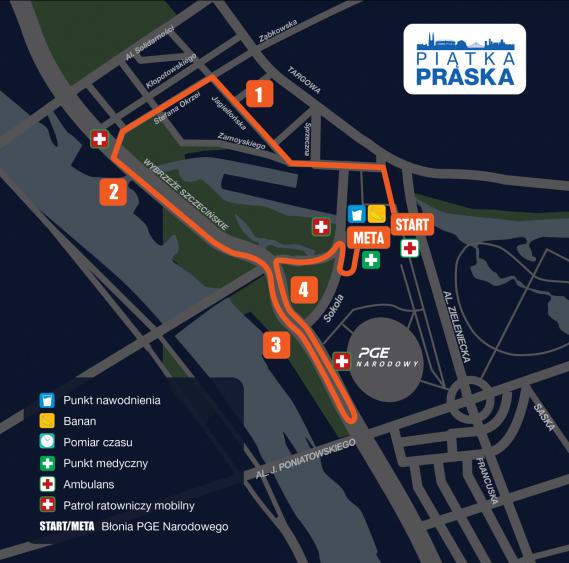 Jako pierwsi na trasę wyruszą zawodnicy mierzący się z dystansem 5 kilometrów. Uczestnicy Praskiej Piątki wystartują o godzinie 19:30, a ich rywalizacja będzie toczyła się na ulicach: Zamoyskiego, Jagiellońskiej, Okrzei, Wybrzeże Szczecińskie (zawodnicy zawrócą przed mostem Poniatowskiego) i z powrotem do Sokolej.