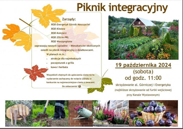 Zarządy: ROD Energetyk Górnik Nauczyciel, ROD Kinowa, ROD Kolejarz, ROD 25-lecia PRL, ROD Waszyngtona zapraszają sąsiadów - mieszkańców okolicznych osiedli na piknik integracyjny w działkowcami. Wydarzenie odbędzie się w sobotę 19 października od godziny 11.00.