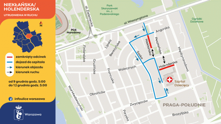 Ulica Holenderska zostanie zamknięta pomiędzy Niekłańską a Londyńską. Peszteńska straci połączenie z Holenderską – na odcinku do Walecznych będzie ruch w dwóch kierunkach. Roboty na Niekłańskiej zaplanowano od Angorskiej do progu zwalniającego przy posesji numer 38. Przejazd zostanie zamknięty, a od Walecznych będzie ruch w dwóch kierunkach. W obu tych miejscach, oraz w pobliżu prac, będą zakazy parkowania.