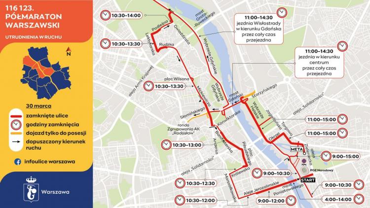 Szczegółowe informacje dotyczące zmian w ruchu i parkowaniu w czasie 116 123. Półmaratonu Warszawskiego można znaleźć na stronie infoulice.um.warszawa.pl. Komunikaty dotyczące kursowania Warszawskiego Transportu Publicznego w czasie imprezy będą dostępne w serwisie wtp.waw.pl.