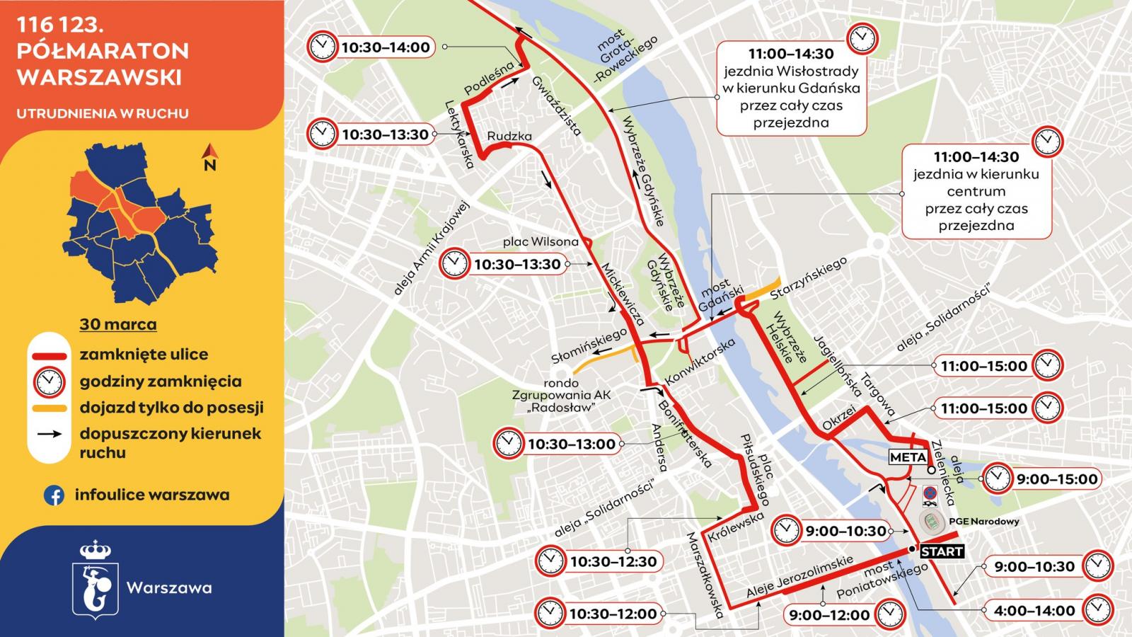 Od godziny 11:00 do 14:30 będzie zamknięta jezdnia Wybrzeża Gdyńskiego w kierunku centrum, na odcinku od mostu Skłodowskiej-Curie do mostu Gdańskiego. Kierowcy nie zjadą na Wisłostradę do centrum z: Pułkowej, mostu Skłodowskiej-Curie, Trasy AK, mostu Grota-Roweckiego i ulicy Krasińskiego. Ruch na nitce w stronę Łomianek przez cały czas trwania zawodów będzie utrzymany.