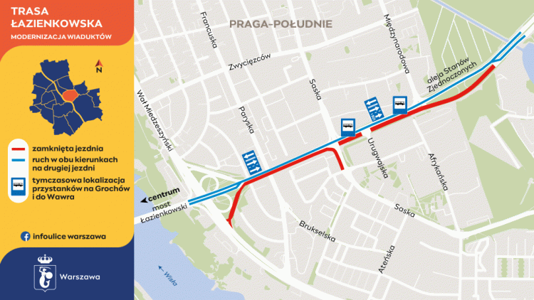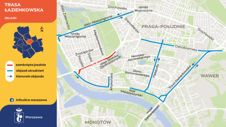 Z Międzynarodowej i Saskiej od strony Zwycięzców będzie można wyjechać na Trasę Łazienkowską. Otwarty pozostanie także skręt w ulicę Urugwajską i wyjazd na trasę w kierunku Grochowa. Nie będzie natomiast zjazdu z trasy na ulicę Saską w kierunku Gocławia.