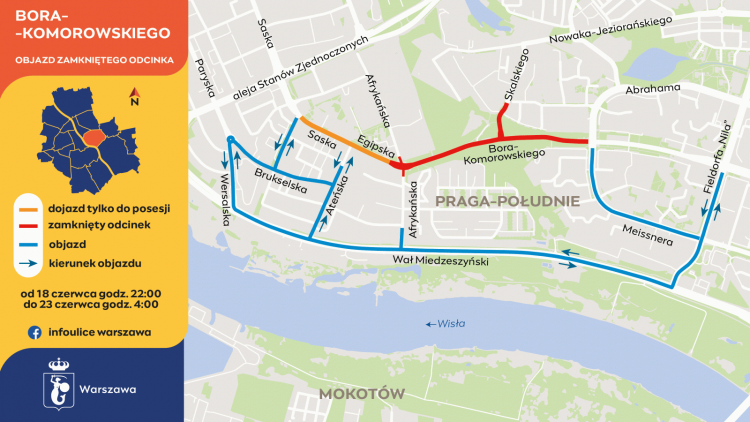 Po stronie Gocławia będzie można przejechać między Abrahama a Messnera. Kierowcy nie pojadą Bora-Komorowskiego w stronę Saskiej Kępy. Z kolei ulicą Skalskiego będzie można dojechać tylko do ostatniego skrzyżowania przed Bora-Komorowskiego.