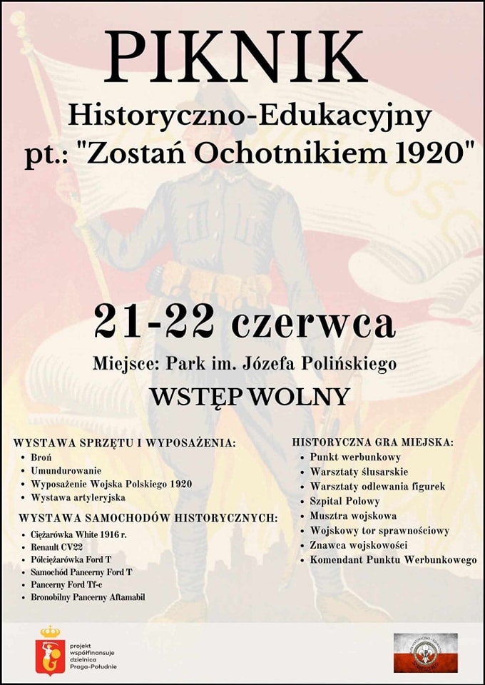 W dniach 21-22 czerwca 2025 r. zapraszamy do parku im. Józefa Polińskiego na Piknik Historyczno-Edukacyjny pn."Zostań ochotnikiem 1920". Bezpłatne wydarzenie odbędzie się w godzinach 12.00 - 17.00.