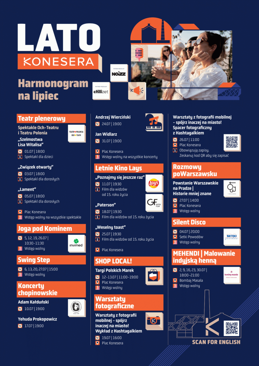 Lato Konesera 2025 to również wiele innych aktywności – Joga pod Kominem z InviMed (6, 13 i 27 lipca oraz 3 sierpnia, godz. 10.30) czy Potańcówki ze SwingStep (każda niedziela lipca i sierpnia, z wyjątkiem 31 sierpnia). Nie zabraknie też potężnej dawki humoru – od 16 do 19 sierpnia już po raz kolejny w trakcie Lata Konesera zagości Koneser Stand-upu, w ramach letniej odsłona Polskiego Festiwalu Komedii 2025 (wydarzenie przeznaczone jest dla osób dorosłych, wstęp bezpłatny). Nie zabraknie historii – 27 lipca Łukasz Ostoja-Kasprzycki (PoWarszawsku), poprowadzi wydarzenie „Powstanie Warszawskie na Pradze – historie mniej znane”.
