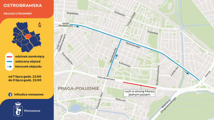 Roboty na Ostrobramskiej rozpoczną się w poniedziałek, 7 lipca, około godziny 22:00 i potrwają do środy, 9 lipca, do godziny 23:00.