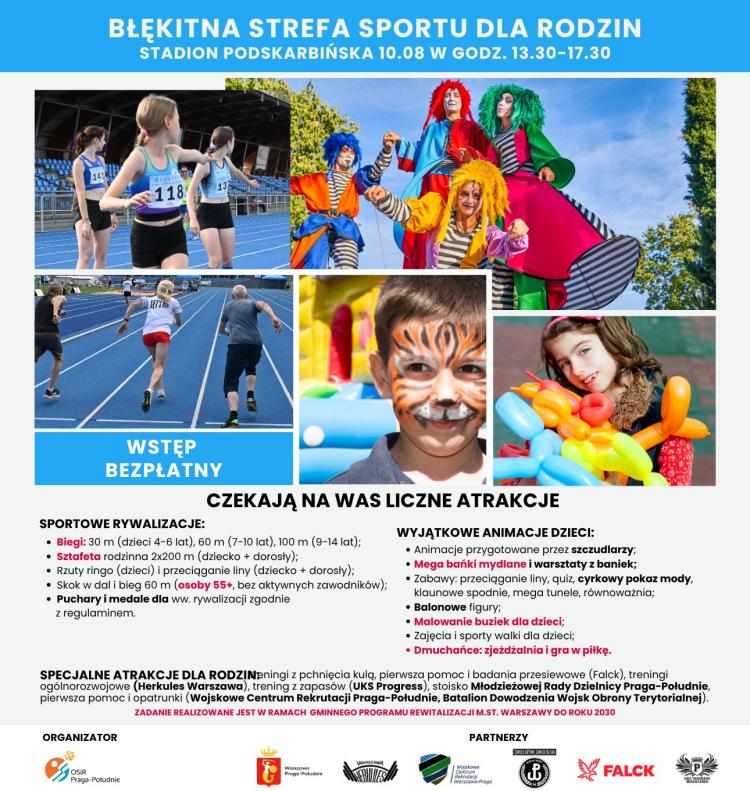 Rodzinny piknik "Błękitna Strefa Sportu dla Rodzin" na Stadionie "Podskarbińska" już w tę niedzielę!. Wydarzenie odbędzie się w godzinach 13.30-17.30. Wstęp wolny!