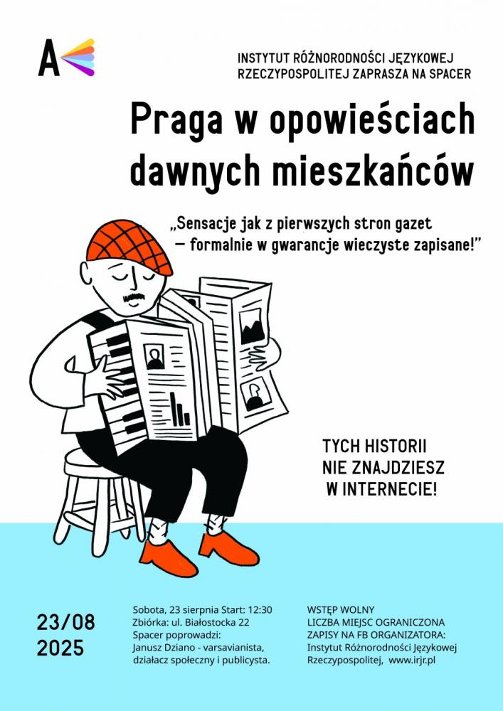 Serdecznie zapraszamy na spacer "Praga w opowieściach dawnych mieszkańców", który w gwarze warszawskiej poprowadzi varsavianista Janusz Dziano. Spotykamy się 23 sierpnia o godzinie 12:30 przy ul. Białostockiej 22. Wydarzenie jest bezpłatne, a liczba miejsc ograniczona. Zapisy: mkleban@irjr.pl