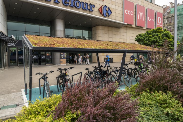 Galeria Wileńska odpowiada na potrzeby rowerzystów - nowa wiata z zielonym dachem