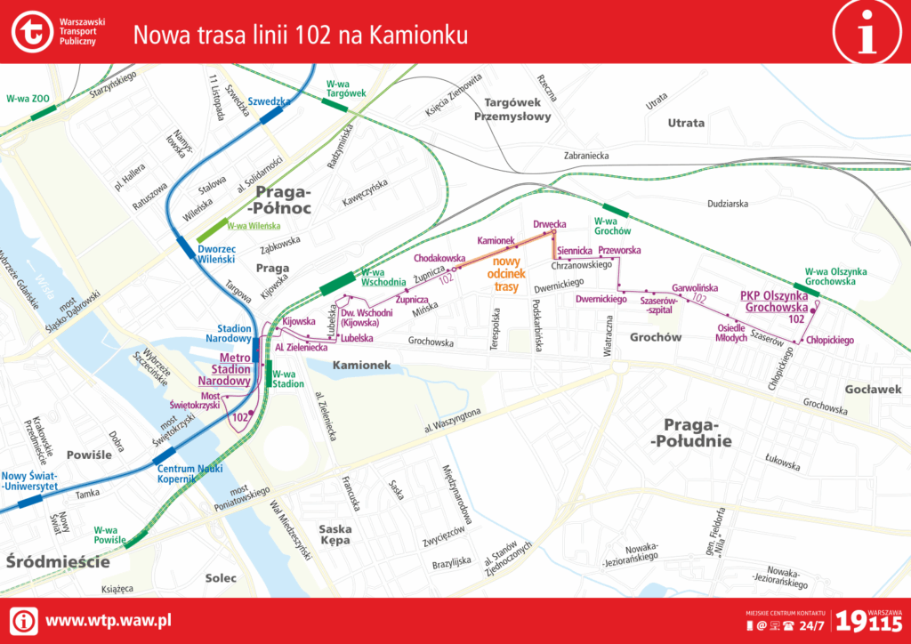 Dobra wiadomość dla mieszkańców nowych osiedli na Kamionku i Grochowie. Od wczoraj linia autobusowa nr 102 została skierowana w obu kierunkach na nową trasę stałą przebiegającą następującym ciągiem ulic: Żupnicza - Drwęcka - Siennicka - Chrzanowskiego i dalej swoją trasą dotychczasową.