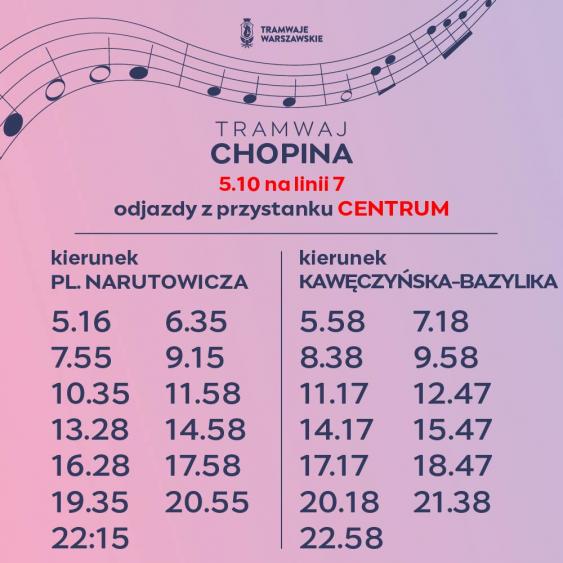 Od kilku dni, w związku z rozpoczynającym się XIX Międzynarodowym Konkursem Pianistycznym im. Fryderyka Chopina, po ulicach Warszawy kursuje specjalny tramwaj w okolicznościowej kolorystyce. W ten weekend 4-5 października można go spotkać na linii 7.