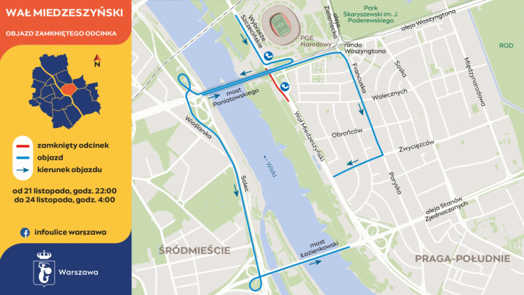 Od piątku (21.11, godz. 22:00) do poniedziałku (24.11, godz. 4:00) zamknięta będzie jezdnia w kierunku ul. Zwycięzców – od PGE Narodowego do ronda Waszyngtona.