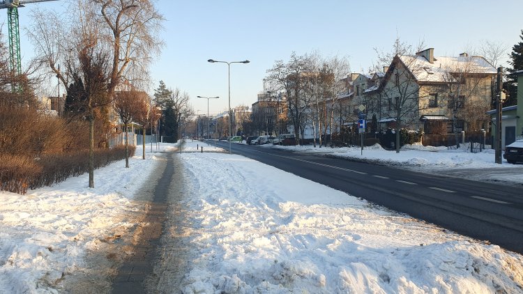 Przegląd sytuacji nie pozostawia złudzeń: droga dla rowerów jest całkowicie nieprzejezdna. Miejscami zalega kilka centymetrów zbitego śniegu, pod którym kryje się lód. Służb odśnieżających nie widać, a rowerzyści, którzy próbują wjechać na trasę, szybko rezygnują i przenoszą się na chodnik.