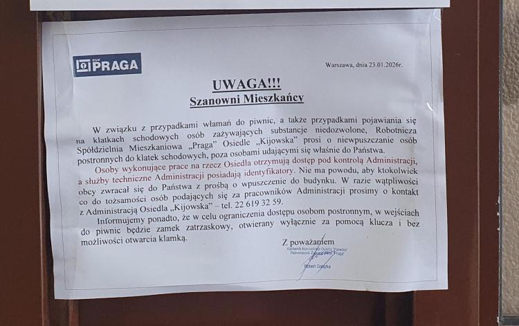 W ostatnich tygodniach na terenie Osiedla "Kijowska", należącego do RSM "Praga", odnotowano przypadki włamań do piwnic. Mieszkańcy zgłaszali również pojawianie się na klatkach schodowych osób zażywających niedozwolone substancje. Sytuacja budzi niepokój, dlatego Spółdzielnia apeluje o zachowanie szczególnej ostrożności.