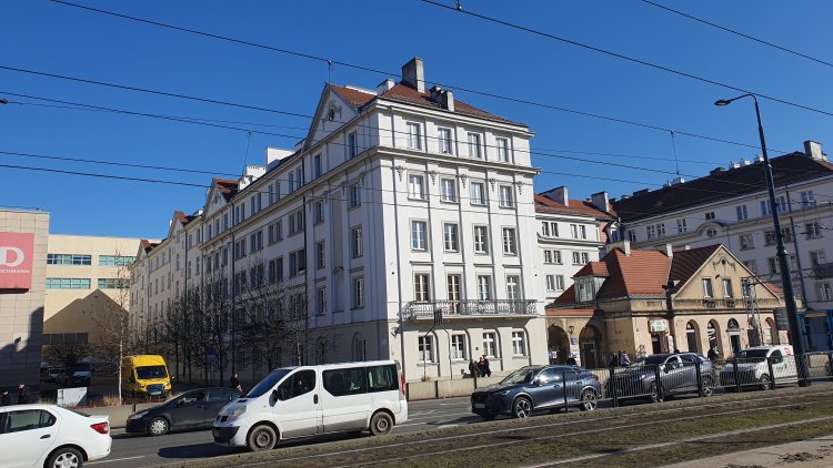 Odnowiona część kamienicy to fragment dawnego domu dla pracowników Ministerstwa Kolei Żelaznych, ukończonego w połowie lat 20. XX wieku. Choć w momencie oddania inwestorem było już Ministerstwo Komunikacji, na balustradach balkonów wciąż można dostrzec skrót starszej nazwy resortu. To detal, który przypomina o burzliwej historii budynku i zmieniających się realiach politycznych tamtego okresu.