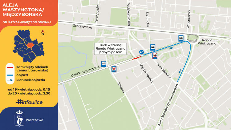 Utrudnienia dotyczą wyłącznie rejonu skrzyżowania. Kierowcy jadący Aleją Waszyngtona w stronę Ronda Wiatraczna będą mogli ominąć zamknięty wjazd, korzystając z objazdu przez: