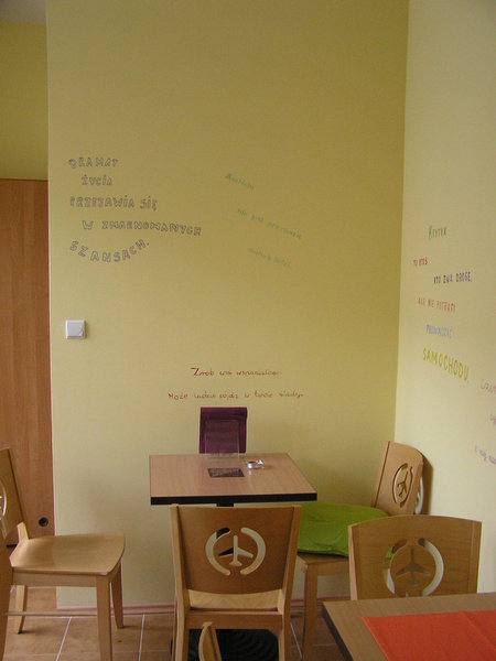 W jasnym, przytulnie urządzonym wnętrzu znajduje się 5 stolików z 15 krzesłami. W razie potrzeby oczywiście można donieść kolejne. Jest ciekawie zaaranżowana toaleta oraz dostęp do internetu. Dzieci są mile widziane. Można też przyjść z dobrze wychowanym psem czy kotem pod pachą...