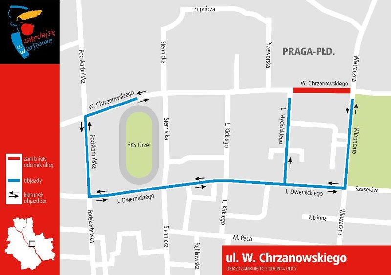 Objazd zamkniętego odcinka wyznaczono ulicami: J. Dwernickiego - L. Mycielskiego lub J. Dwernickiego - Podskarbińska - W. Chrzanowskiego.