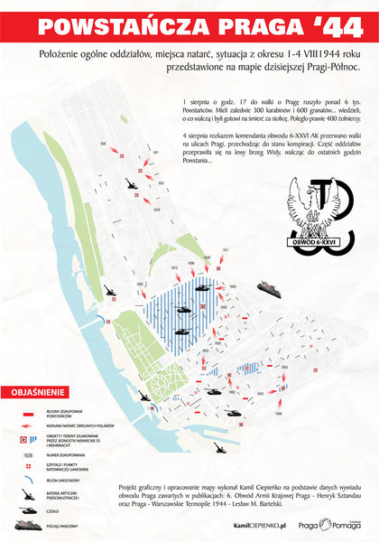 Projekt graficzny i opracowanie mapy wykonał Kamil Ciepieńko, radny Praskiej Wspólnoty Samorządowej z Pragi Północ, na podstawie danych wywiadu obwodu Praga zawartych w publikacjach: 6. Obwód Armii Krajowej Praga - Henryk Sztandau oraz Praga - Warszawskie Termopile 1944 - Lesław M. Bartelski.