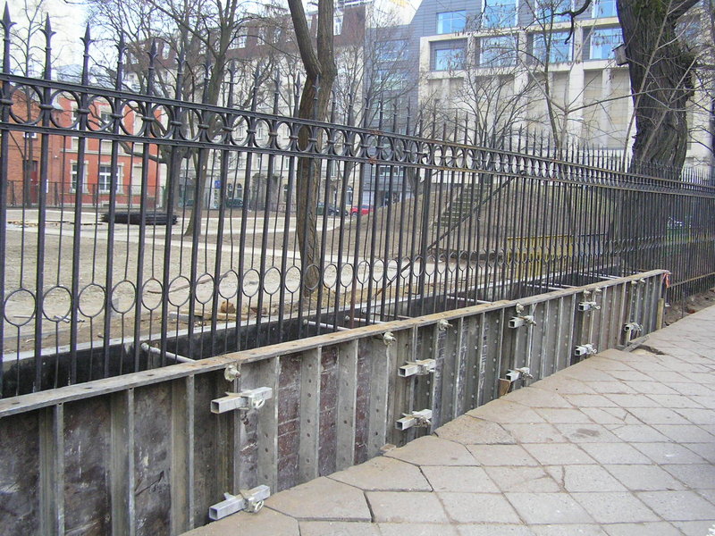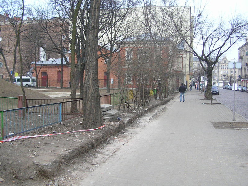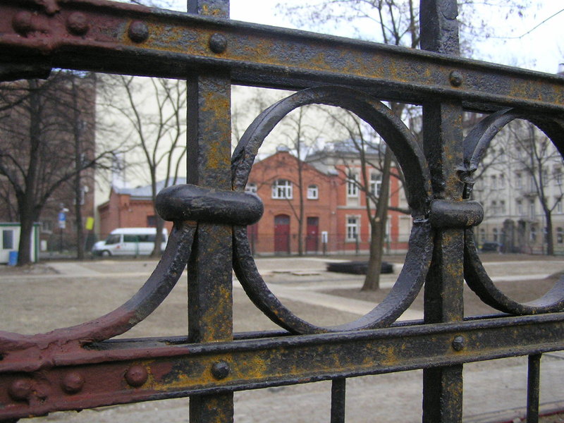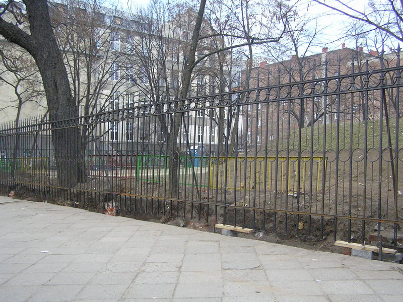 Na rogu Jagiellońskiej i Kłopotowskiego rozpoczął się montaż zdemontowanego 3 miesiące temu historycznego ogrodzenia dawnej synagogi. Niestety, gdy w niedzielne popołudnie odwiedziliśmy plac budowy, przygotowane do montażu ponad 100 - letnie elementy leżały na ziemi, przez nikogo nie chronione. Wszystkie wejścia na teren modernizowanego placu zabaw były otwarte a budka pracownika ochrony była pusta...