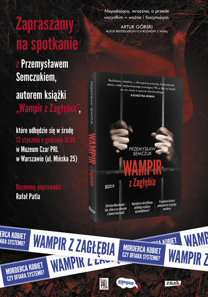 Zapraszamy tylko osoby o mocnych nerwach! Odkryjemy tajemnice polowania na najsłynniejszego seryjnego mordercę okresu PRL-u nazywanego „Wampirem z Zagłębia”. Rozmowę z autorem - Przemysławem Semczukiem przeprowadzi założyciel Muzeum Czar PRL - Rafał Patla.
