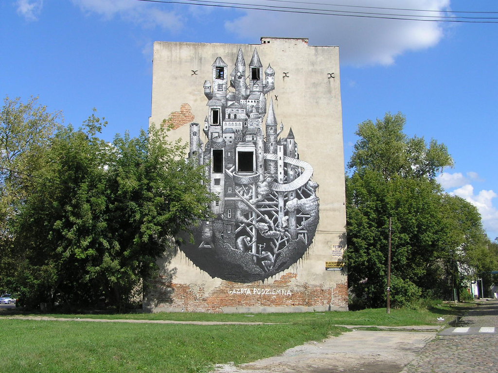 Czarno-biały mural nie ma oficjalnej nazwy. Jednak z uwagi na przedstawione przez brytyjskiego artystę Phlegma motywy bywa nazywany "Zamkiem". Charakterystyczne dla Phlegma postacie budują od fundamentów swój zamek z wieżyczkami i pomostami. Co ciekawe, istniejące w kamienicy puste otwory okienne stały się częścią namalowanego zamczyska.